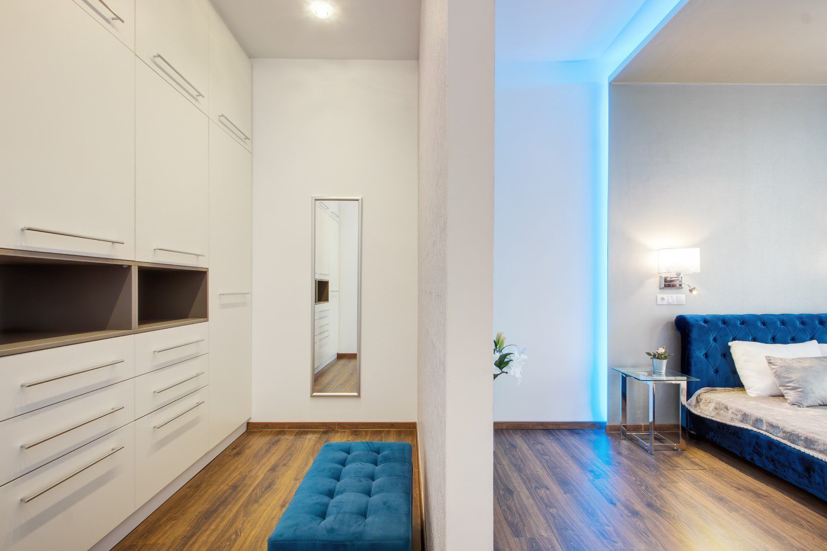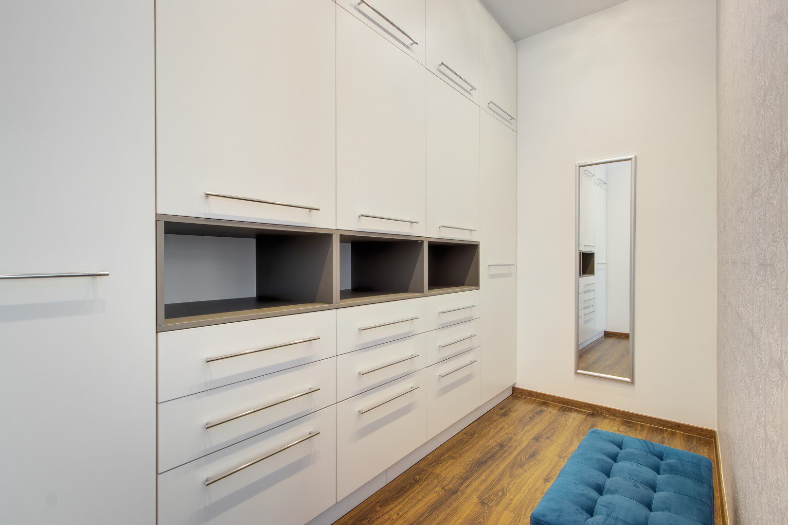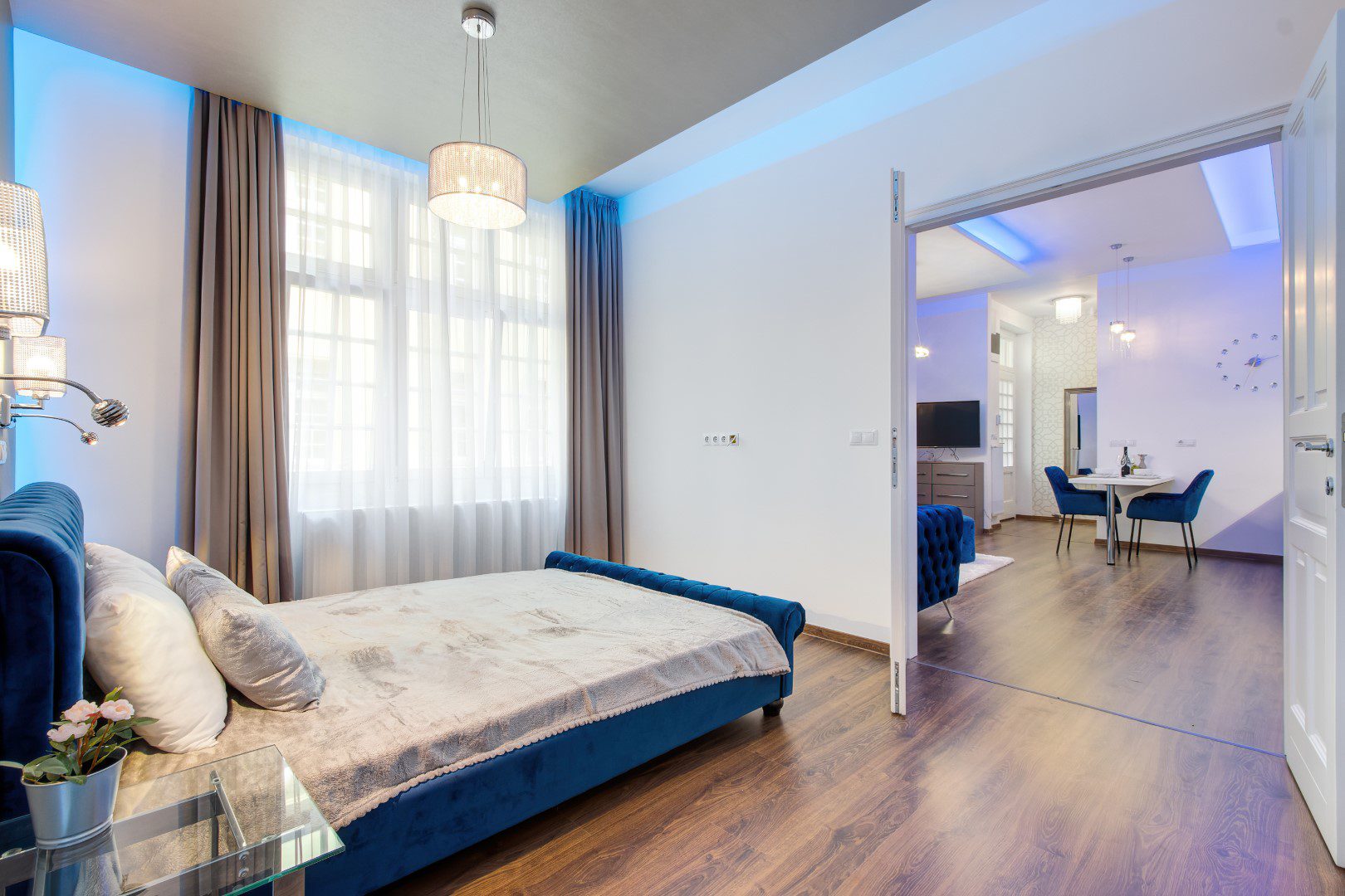 A lakás 56 nm alapterületű, két szobás és a hálószobából egy gardróbszoba is nyílik. A fürdőszoba és a mellékhelység külön van, azonban a mellékhelység a fürdőszobából nyílik. Bútorozott, gépesített (mosógép, mosogatógép, hűtőszekrény, sütő, főzőlap, mikro, TV).
