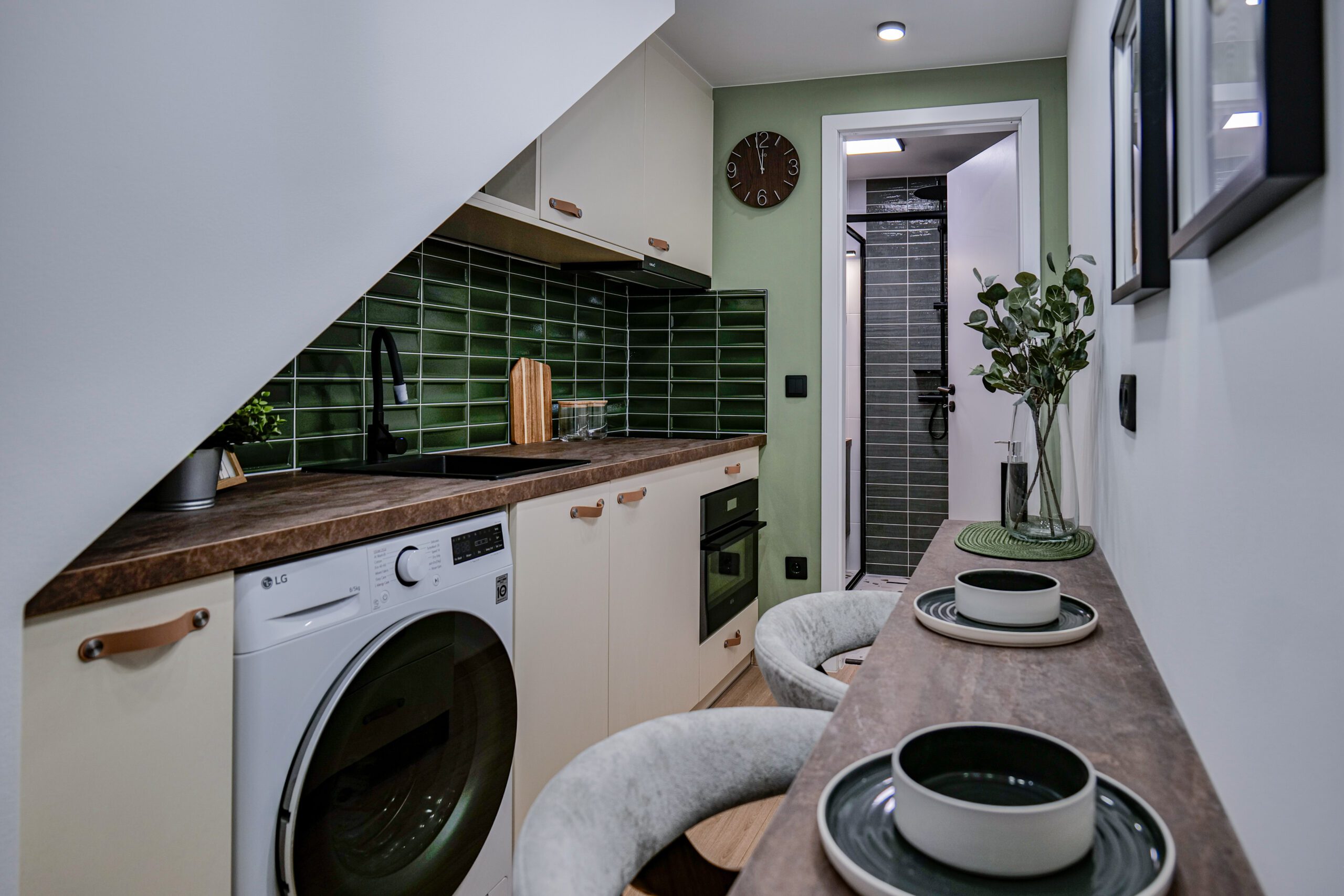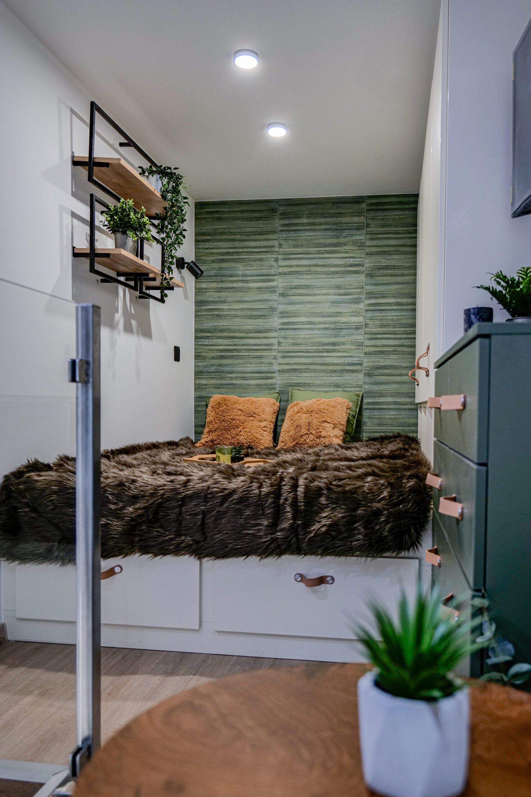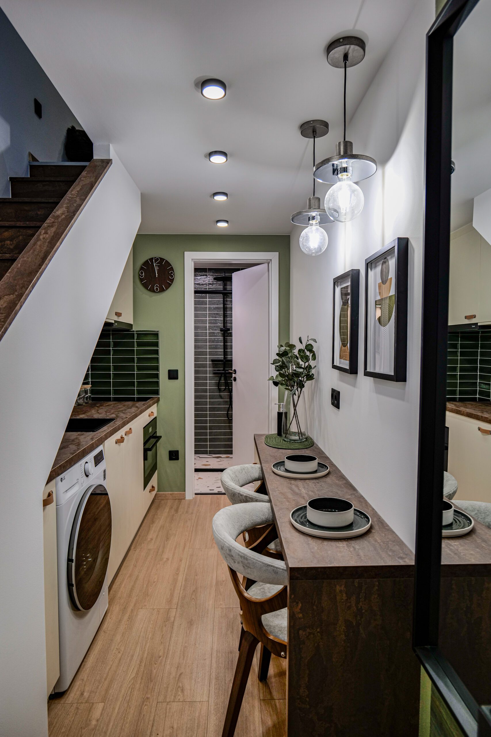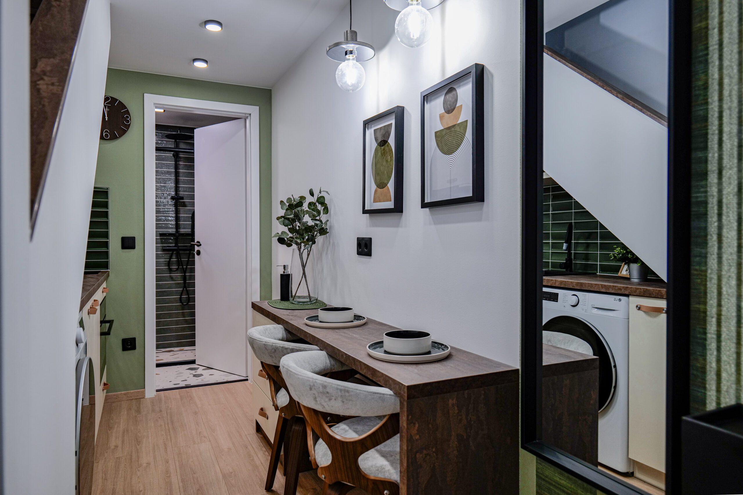 TimeLessDesign lakberendezői által készített tervek alapján készült el a lakás. 10m2 alapterületű kis nagyon magas minőségben kivitelezett lakás. Galéria 7m2, ami tele van tárolókkal, még az ágy alatt is. Az alsó szinten van konyha-étkező, fürdőszoba. Az emeleten egy háló és a nappali rész került elhelyezésre. Tv 360 fokban forgatható, így a nappaliból és az ágyból is nézhető.