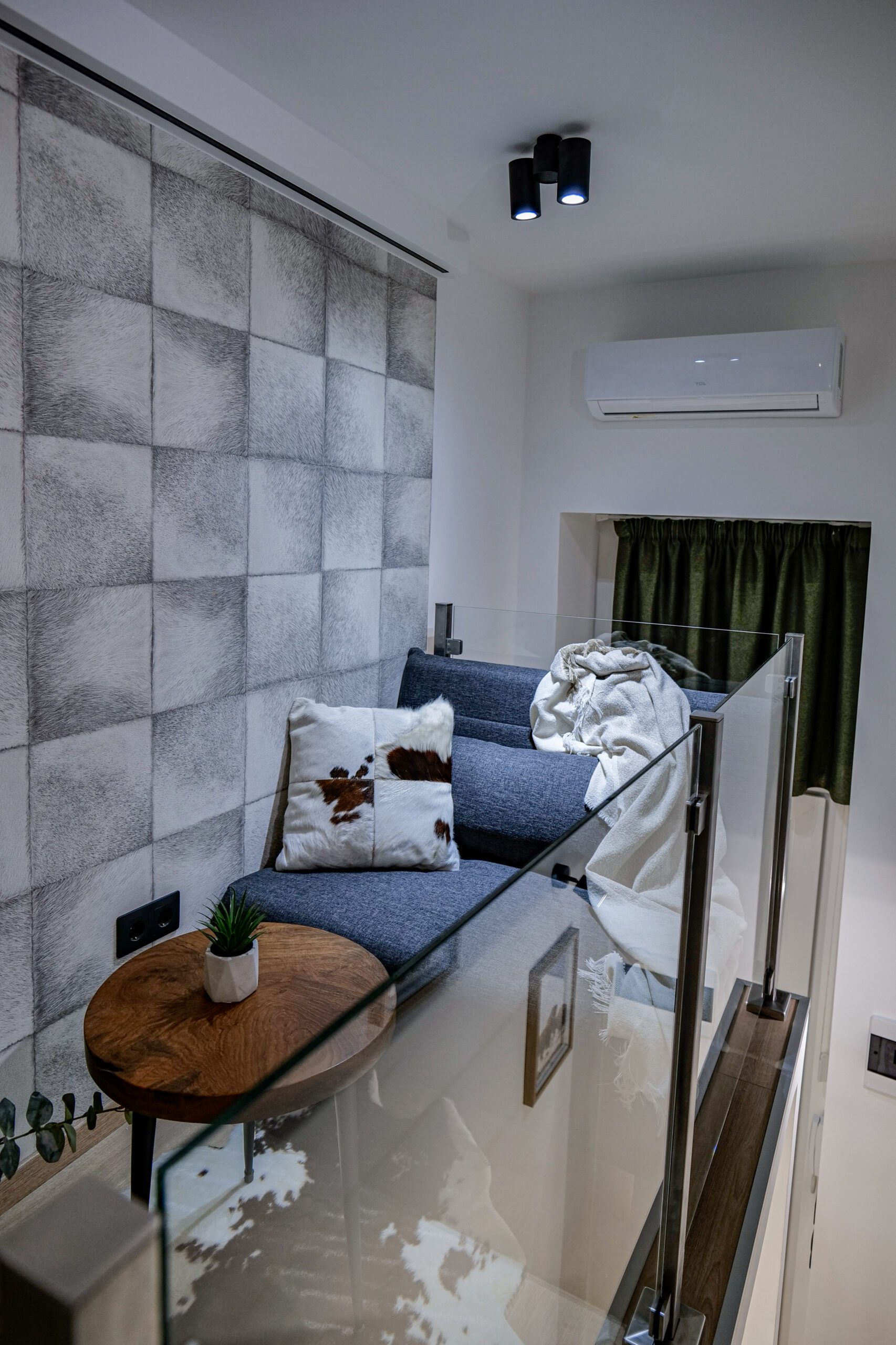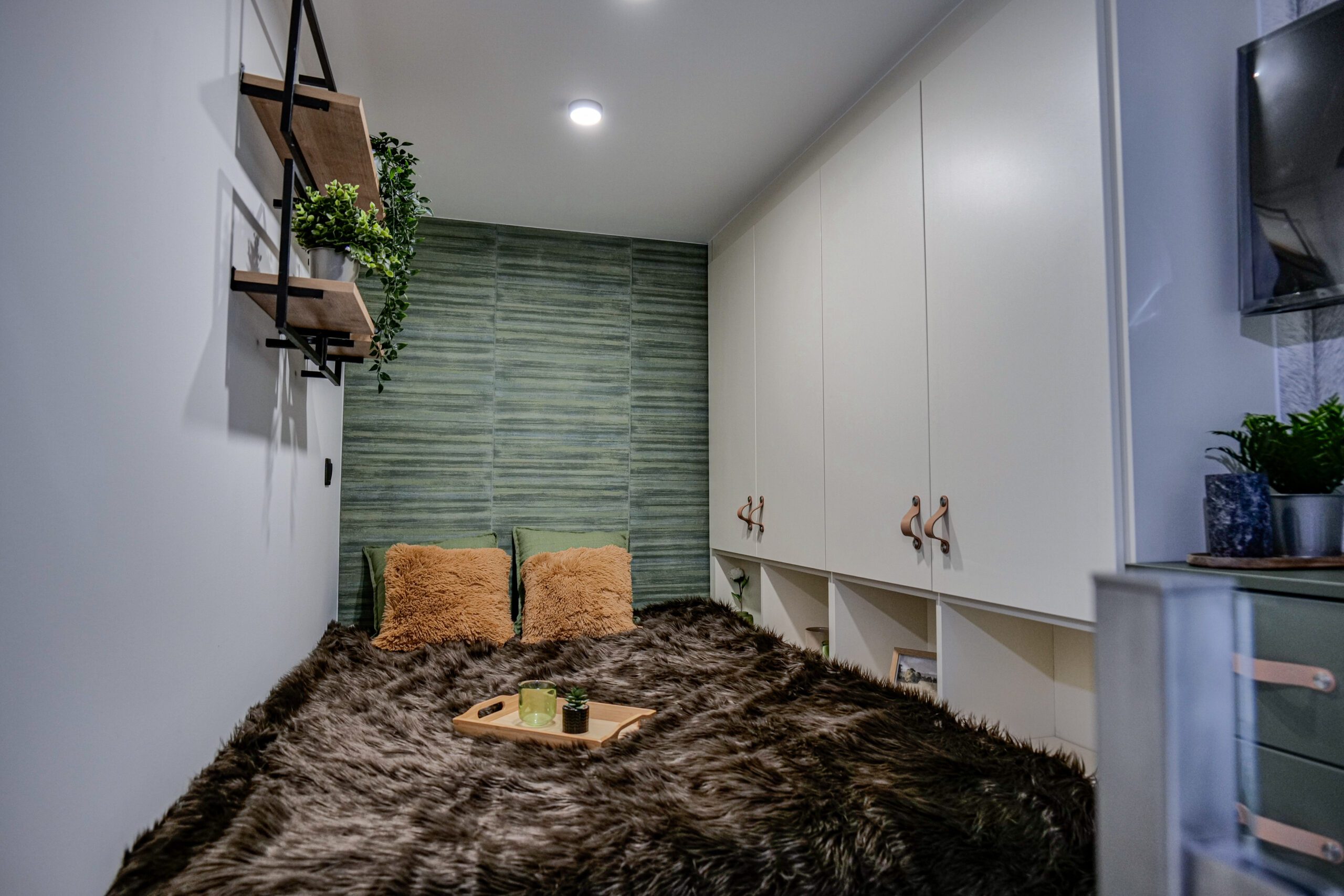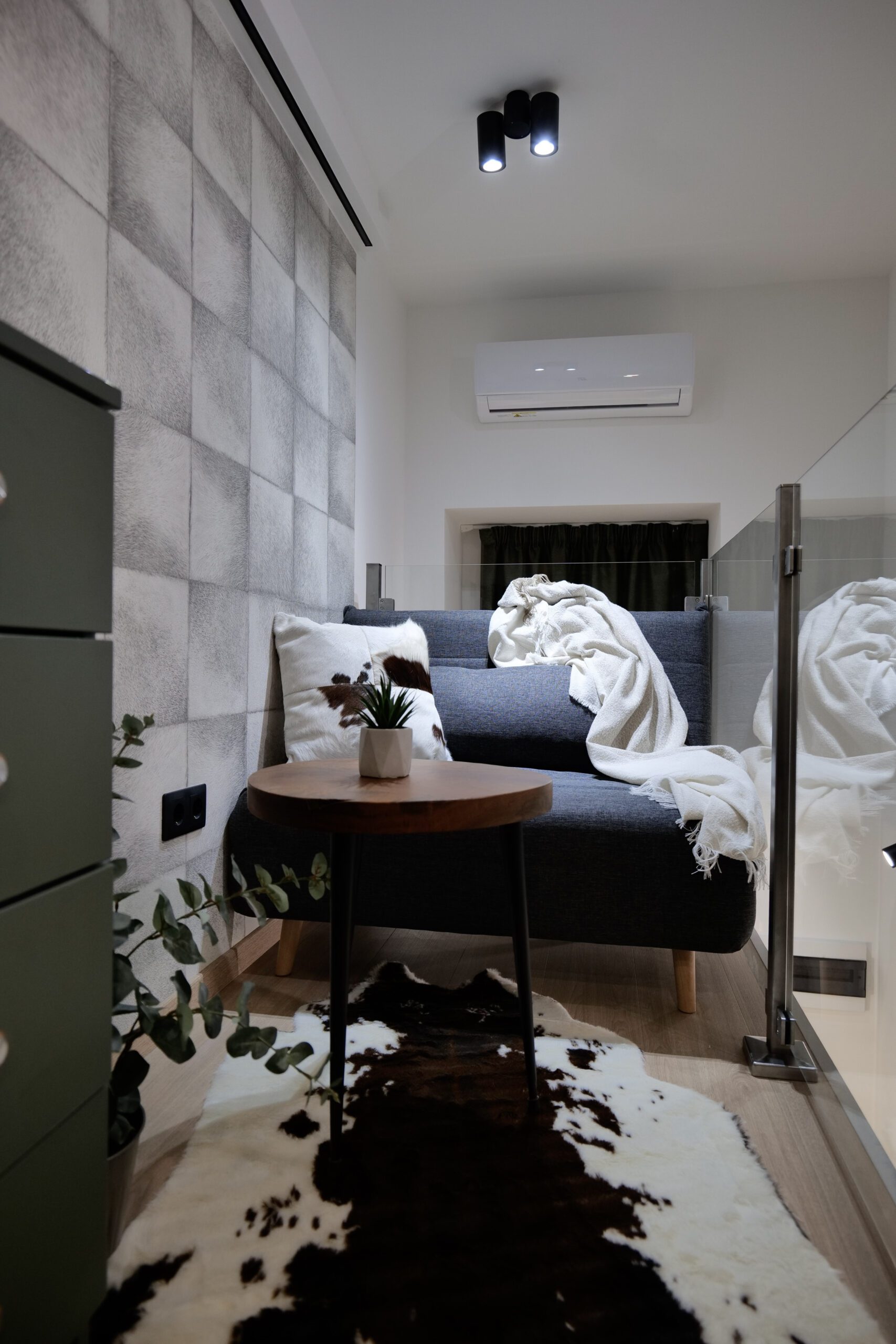 TimeLessDesign lakberendezői által készített tervek alapján készült el a lakás. 10m2 alapterületű kis nagyon magas minőségben kivitelezett lakás. Galéria 7m2, ami tele van tárolókkal, még az ágy alatt is. Az alsó szinten van konyha-étkező, fürdőszoba. Az emeleten egy háló és a nappali rész került elhelyezésre. Tv 360 fokban forgatható, így a nappaliból és az ágyból is nézhető.